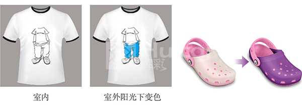 光變粉:外觀為白色粉未狀,粒徑大約:1~10μm,在太陽光或紫外線照射下,從無色變成有色,本身具有可逆性。顏色分為:紅、黃、蘭、紫。適用于布匹、服裝、塑膠、玩具、鞋材、印刷等工藝。