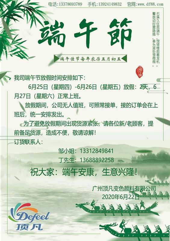 時間飛逝,轉眼間又是一年端午時,又聞粽飄千里香,2020的端午佳節即將到來。廣州頂凡公司向全體員工及各位新老客戶致以節日的問候,為了度過歡樂、祥和的端午節,公司放假時間為:6月25-26日、27號正常上班,放假期間,可照常接單,如需訂貨可聯系鄒經理:13312849841。